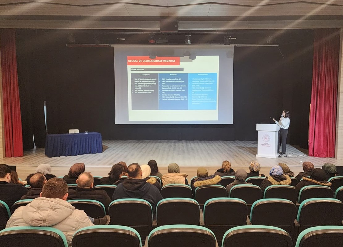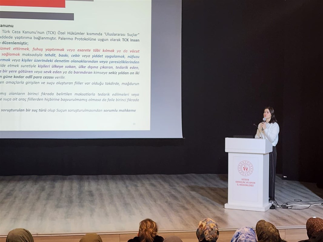 Programın ikinci oturumunda,İl Göç İdaresi Müdürlüğü Hukuk İşleri Çalışma Grup Başkanlığı’nda görev yapan İl Göç Uzmanı Yıldız Çelikkol Devrez tarafından “İnsan Ticareti ile Mücadele Farkındalık Eğitimi” gerçekleştirildi.Eğitim kapsamında,insan ticaretiyle mücadelede toplumsal farkındalığın önemi ve olası durumlarda izlenmesi gereken süreçler hakkında bilgilendirmeler yapıldı.